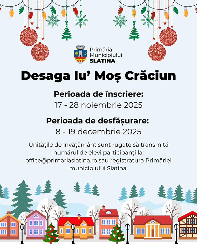 Primăria Municipiului Slatina anunță deschiderea înscrierilor pentru programul „Desaga lu’ Moș Crăciun”, eveniment devenit tradiție în rândul copiilor din oraș, organizat anual în preajma sărbătorilor de iarnă. Grădinițele și școlile din municipiu – de la clasa pregătitoare până la clasa a III-a – sunt invitate să participe la un adevărat maraton de colinde și momente artistice pregătite de cei mici.